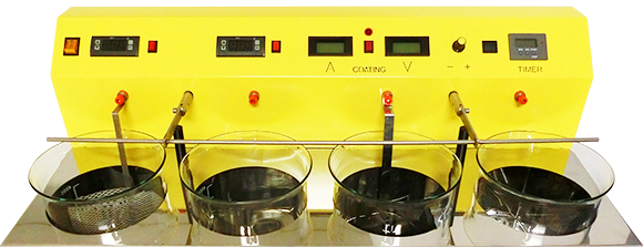 Devido à capacidade dos vasos de 5 litros e às características do retificador (0-12V / 0-25A) este equipamento oferece grande autonomia nos processos galvânicos com metais preciosos. Além disso, pode funcionar também como Estação E-coating possibilitando revestimentos de protecção anti-oxidante ou decorativos com lacas cataforéticas nano-cerâmicas em superfícies metálicas.