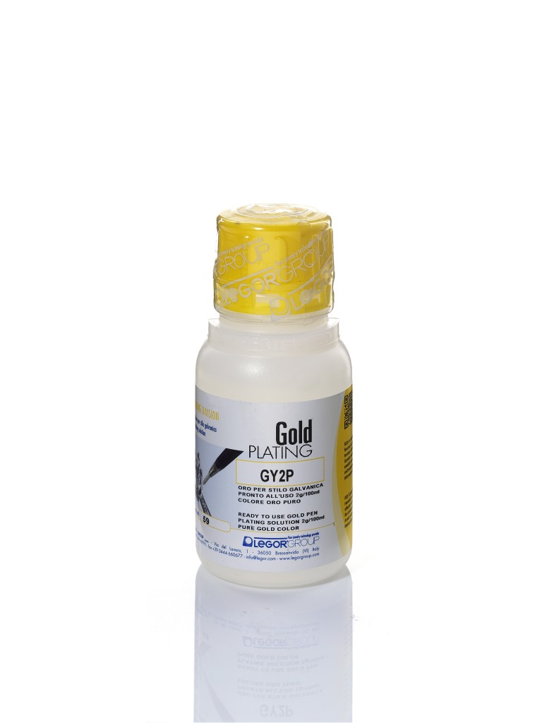 A GY2P é uma solução electrolítica de ouro amarelo com uma concentração de 20g/litro e que produz depósitos brilhantes da cor do ouro puro 24Kt. A cor é mesmo a do ouro puro dado que nenhum outro metal é usado como ligante.